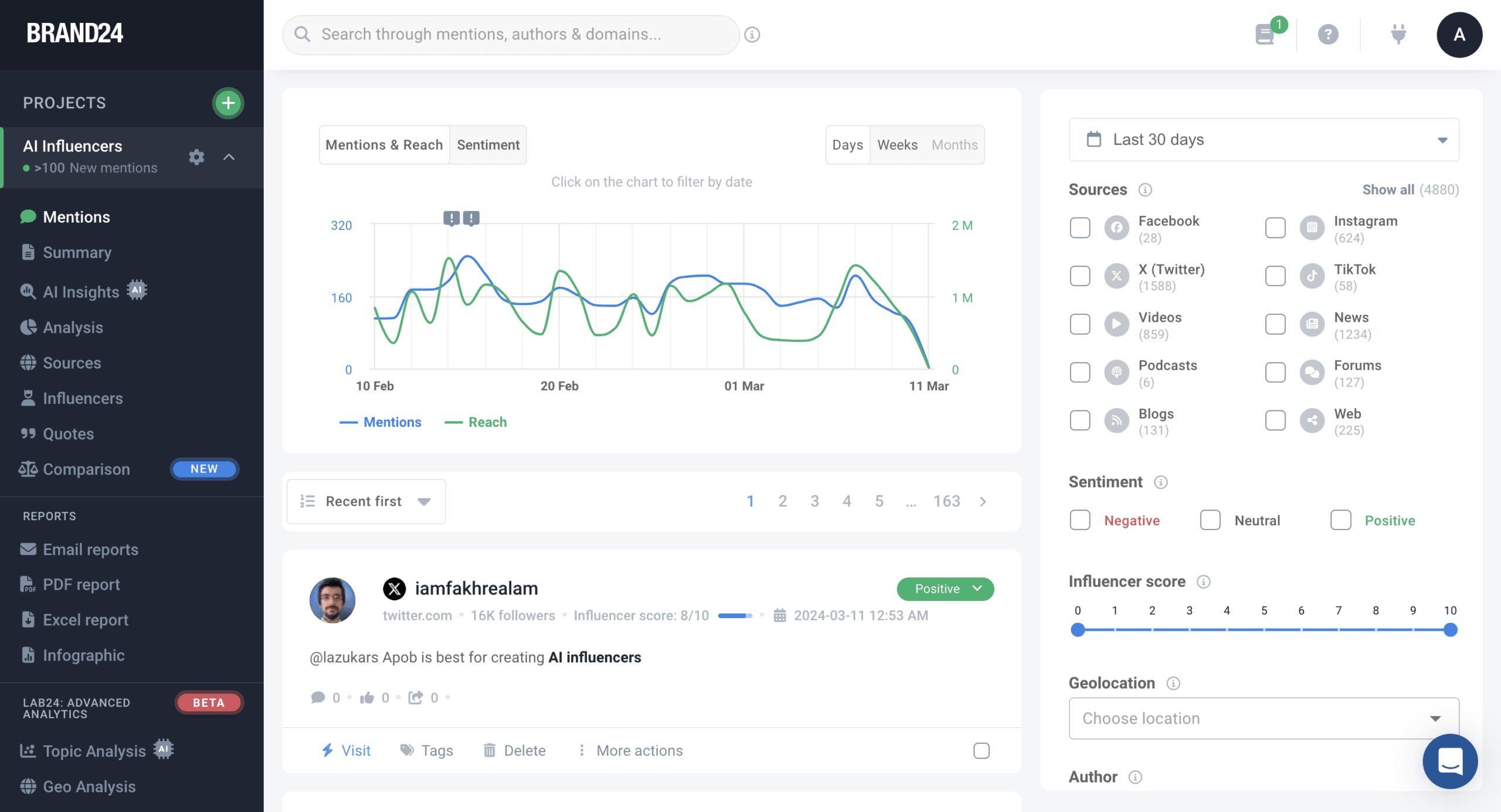 Brand24 se distingue par un ensemble complet de fonctionnalitĂ©s sophistiquĂ©es conçues pour transformer la surveillance des mĂ©dias sociaux en avantage concurrentiel stratĂ©gique. La surveillance en temps rĂ©el constitue le cĹ“ur de la plateforme, scrutant continuellement plus de 25 millions de sources incluant Facebook, Instagram, Twitter/X, LinkedIn, YouTube, TikTok, Reddit, Medium, Quora, les sites d’actualitĂ©s, blogs, forums, podcasts, newsletters et plateformes de reviews. L’analyse de sentiment alimentĂ©e par l’IA offre une prĂ©cision exceptionnelle dans la classification des mentions comme positives, nĂ©gatives ou neutres, avec des algorithmes propriĂ©taires capables de comprendre le contexte, l’ironie et les nuances linguistiques. La dĂ©tection d’Ă©vĂ©nements IA identifie automatiquement les pics d’activitĂ© et leurs causes, permettant aux Ă©quipes de comprendre rapidement pourquoi leur marque gĂ©nère soudainement plus de discussions. L’assistant de marque IA fournit des recommandations personnalisĂ©es basĂ©es sur l’analyse des donnĂ©es collectĂ©es, suggĂ©rant des actions concrètes pour amĂ©liorer la perception de la marque. L’analyse des influenceurs rĂ©vèle les voix les plus importantes dans votre secteur, avec des mĂ©triques dĂ©taillĂ©es sur leur portĂ©e, engagement et influence potentielle. Les capacitĂ©s de reporting sont exceptionnellement flexibles, permettant de crĂ©er des tableaux de bord personnalisĂ©s, des rapports automatisĂ©s quotidiens ou hebdomadaires, des prĂ©sentations PowerPoint prĂŞtes Ă partager et des exports Excel pour des analyses approfondies. Le système d’alertes intelligent notifie instantanĂ©ment les Ă©quipes via email, Slack, Microsoft Teams ou notifications push mobiles en cas de mentions critiques, pics d’activitĂ© ou changements de sentiment. La recherche boolĂ©enne avancĂ©e permet de crĂ©er des requĂŞtes sophistiquĂ©es combinant mots-clĂ©s, opĂ©rateurs et filtres pour capturer prĂ©cisĂ©ment les mentions pertinentes. L’analyse gĂ©ographique rĂ©vèle la distribution gĂ©ographique des mentions, essentielle pour les marques internationales ou les campagnes localisĂ©es.