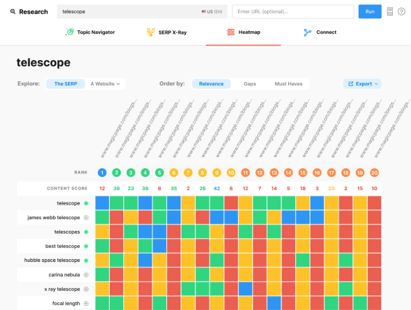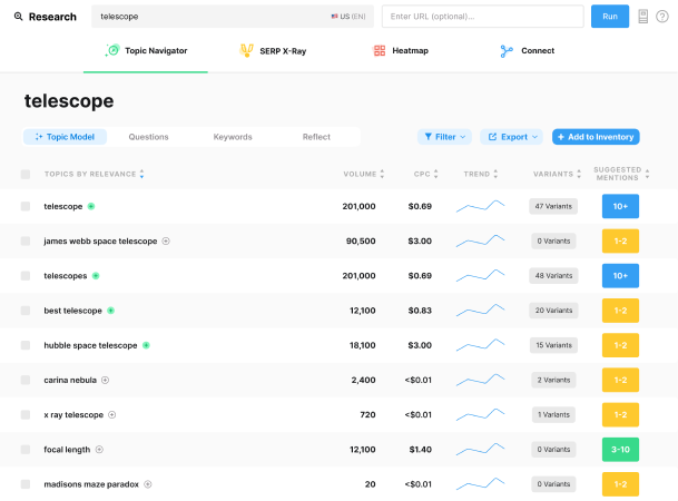 L’inventaire de contenu automatisĂ© constitue la fonctionnalitĂ© fondamentale de MarketMuse, analysant l’intĂ©gralitĂ© du site pour crĂ©er une cartographie complète des pages, sujets et performances avec mise Ă jour rĂ©gulière. Le système de modĂ©lisation de sujets brevetĂ© analyse des centaines Ă milliers de pages pour chaque requĂŞte, Ă©liminant les contenus de faible qualitĂ© et calculant les relations thĂ©matiques avec une prĂ©cision inĂ©galĂ©e. Les briefs de contenu personnalisĂ©s se dĂ©clinent en 9 types spĂ©cialisĂ©s (Article, Comparaison, FAQ, Guide, How-to, Listicle, Local, News/Event, Product Review) fournissant des recommandations structurĂ©es pour optimiser chaque format. L’analyse de difficultĂ© personnalisĂ©e rĂ©vèle la facilitĂ© relative de classement pour chaque sujet basĂ©e sur l’autoritĂ© existante du site, transformant la priorisation en science exacte. Le système d’analyse concurrentielle SERP examine les stratĂ©gies des concurrents pour identifier les opportunitĂ©s nĂ©gligĂ©es et les angles de diffĂ©renciation. Les recommandations de liens internes optimisent l’architecture du site en suggĂ©rant des connexions stratĂ©giques entre contenus pour renforcer l’autoritĂ© thĂ©matique. Le Topic Navigator permet d’explorer visuellement les relations entre sujets et d’identifier les clusters Ă fort potentiel. Les documents de stratĂ©gie de contenu gĂ©nèrent des plans complets en quelques minutes, incluant prioritĂ©s, recommandations et mĂ©triques de performance. L’exportation de donnĂ©es facilite l’intĂ©gration avec d’autres outils et workflows existants. Le tableau de bord analytique centralise les mĂ©triques clĂ©s pour un suivi de performance en temps rĂ©el.